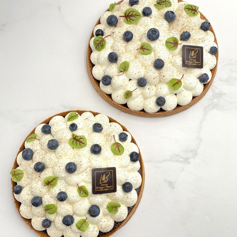 Crémeux à la Myrtille, biscuit Amande, confit Myrtille, ganache montée à la Vanille de Madagascar et ses Myrtille Fraîche.